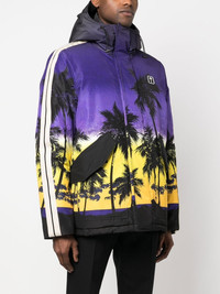 sunset-print hooded jacket purple/black/yellow padded design palm tree print gradient effect logo patch at the chest drawstring hood side stripe detailing two front flap pockets long sleeves straight hem Made In Italy Composition Outer: Polyester 100%, Cotton 100% Lining: Polyester 100% SIZE & FIT Model measurements Height 6 ft 2 in(1.88 m) Bust/Chest 36.61 in(93 cm) Hips 35.82 in(91 cm) Waist 27.95 in(71 cm) Measurement CHEST 47.24 in(120 cm) SLEEVE LENGTH 36.22 in(92 cm) WAIST 47.24 in(120 cm) Shoulder Width 19.29 in(49 cm) Washing instructions Machine Wash