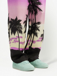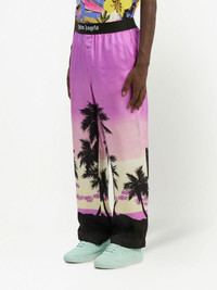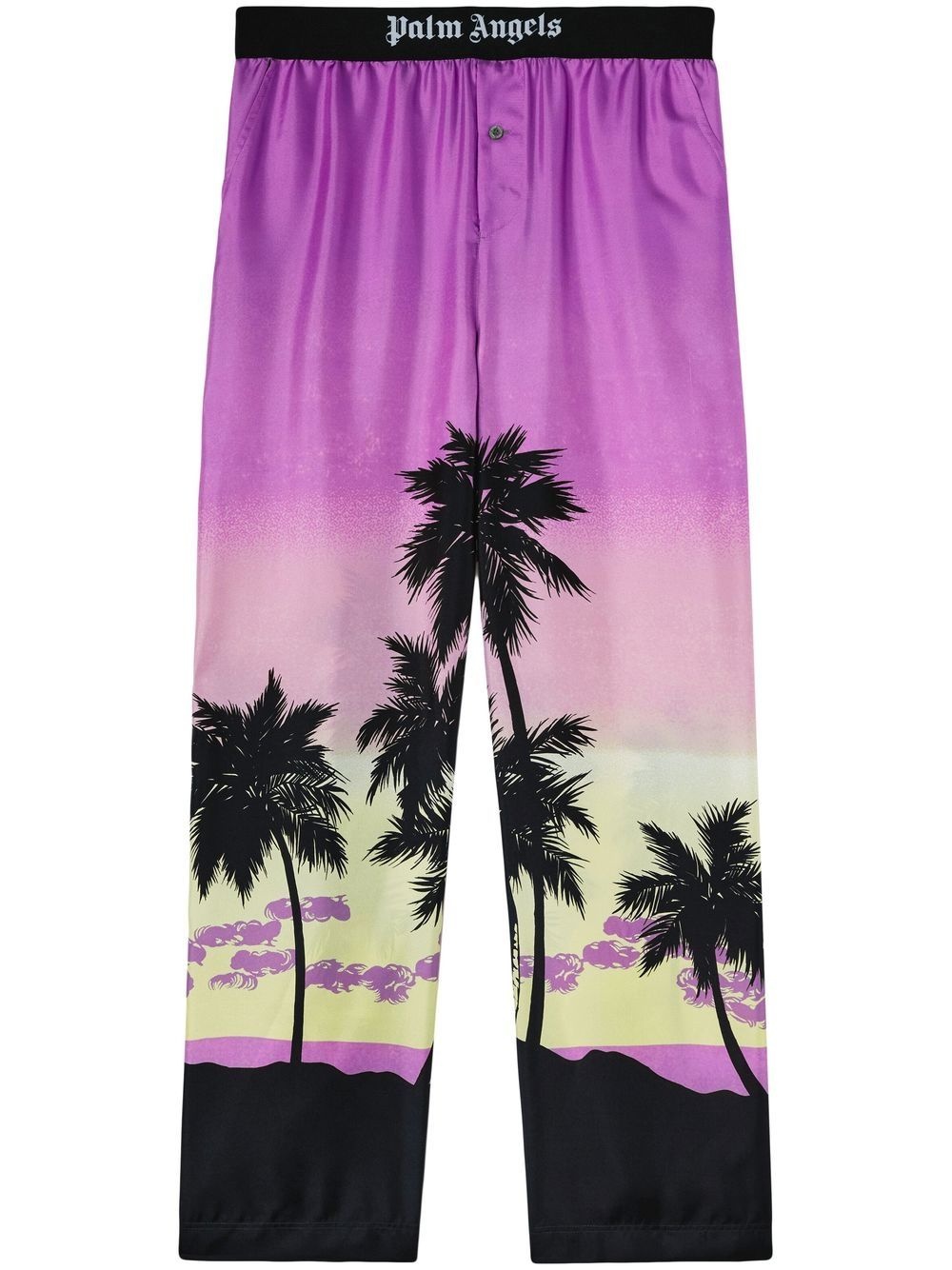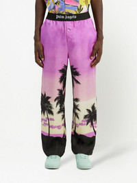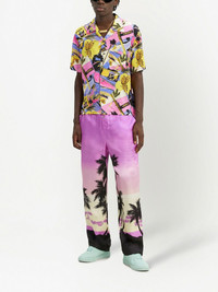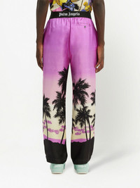 sunset-print straight trousers amethyst purple/black palm tree print logo waistband straight leg two side slit pockets rear welt pocket Made in Italy Composition Silk 100%, Polyamide 67%, Polyester 23%, Elastane 10% Washing instructions Dry Clean Only