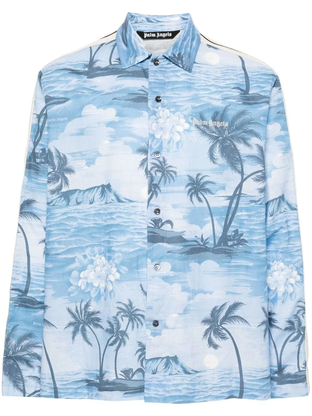 Sunset-print track shirt This blue cotton and linen-blend Palm Angels shirt combines vintage graphics with elements of the brand’s hallmark track suit styles. The tropical Sunset print recalls those found on retro tops while the side stripes lend signature sporty detail. Highlights - Indigo blue - Cotton-linen blend - All-over graphic print - Pointed flat collar - Long sleeves - Side stripe detailing - Embroidered logo at the chest - Short side slits - Straight hem - Front button fastening Made in Italy Composition Polyester 100%, Linen/Flax 55%, Cotton 45% SIZE & FIT Model measurements Height 6 ft 2 in(1.87 m) Bust/Chest 36.22 in(92 cm) Hips 37 in(94 cm) Waist 27.95 in(71 cm) FittingInformation Designed for a regular fit, allowing for a comfortably loose fit throughout the body Made from a midweight non-stretch fabric This piece fits true to size – take your usual size Washing instructions Machine Wash