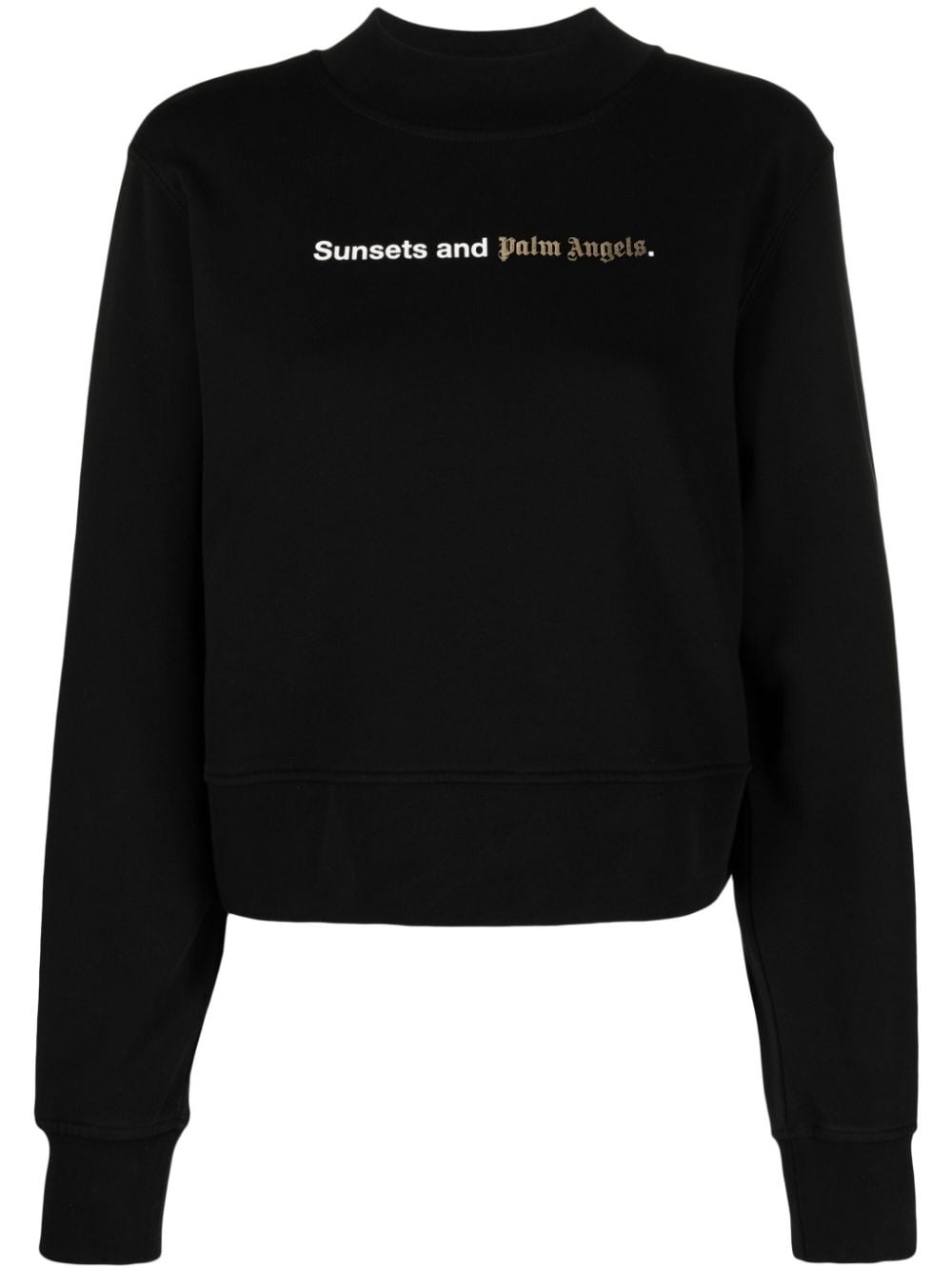 Sunsets-print cotton sweatshirt Fronted with a slogan that reads 'Sunsets and Palm Angels' in white and shimmering gold lettering, this black cotton sweatshirt reflects the coastal, carefree Californian spirit that inspires the Italian fashion label. Highlights - Black - Cotton - Slogan print to the front - Logo print to the front - Mock neck - Long sleeves - Straight hem Imported Composition Cotton 100% SIZE & FIT Model measurements Height 5 ft 10 in(1.78 m) Bust/Chest 30.7 in(78 cm) Hips 34.64 in(88 cm) Waist 23.22 in(59 cm) FittingInformation Designed for a relaxed fit, this piece allows for comfort and movement when worn Made with a midweight knit, this piece offers some stretch This piece fits true to size – take your usual size Washing instructions Hand Wash