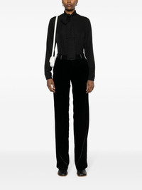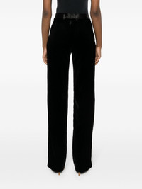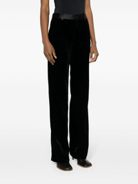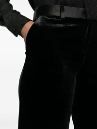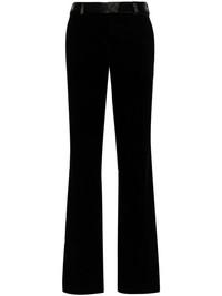 velvet tailored trousers Highlights - Black - Velvet - Pressed crease - Satin trim - High-waisted - Concealed front fastening - Belt loops - Tailored cut - Two side slit pockets Imported Composition Viscose 82%, Silk 18% SIZE & FIT Model measurements Height 5 ft 11 in(1.8 m) Bust/Chest 31.49 in(80 cm) Hips 36.61 in(93 cm) Waist 24.4 in(62 cm) FittingInformation Designed for a straight-leg fit, these trousers allow for a close fit at the waist and an unrestricted, comfortable fit over the leg Made from a midweight non-stretch fabric This piece fits true to size – take your usual size Washing instructions Dry Clean Only