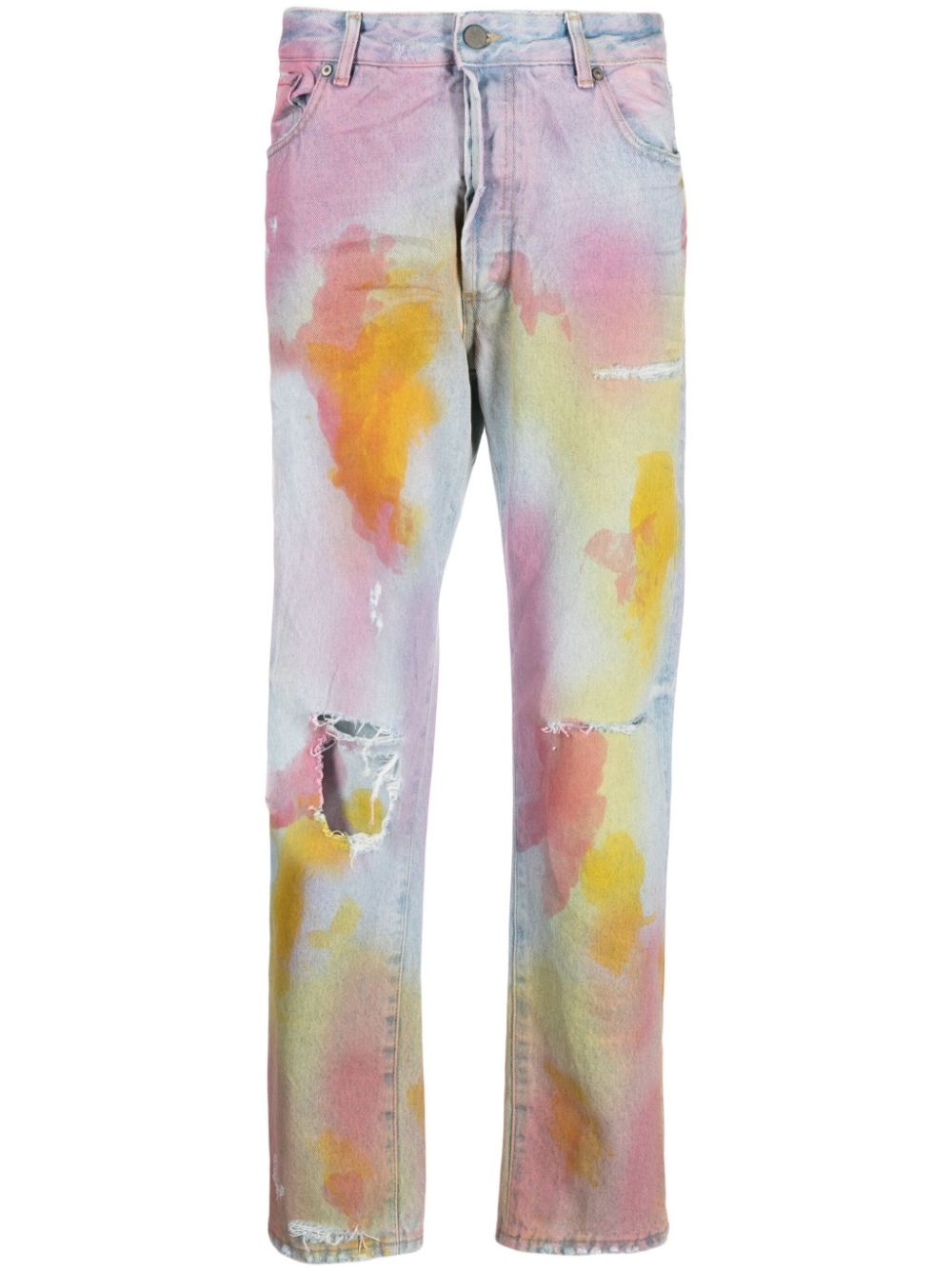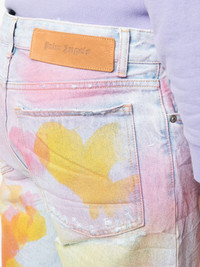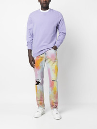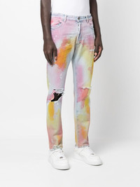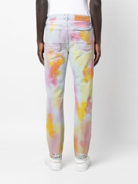 tie dye-print slim-fit jeans Palm Angels' laid-back aesthetic gives life to playful designs, like these slim-fit jeans. Over a light-washed denim construction, a multicoloured tie-dye print elevates the look. Made in Italy Composition Lining: Cotton 100% Outer: Cotton 100%, Leather 100% SIZE & FIT Model measurements Height 6 ft 2 in(1.87 m) Bust/Chest 36.41 in(92.5 cm) Hips 37 in(94 cm) Waist 29.52 in(75 cm) FittingInformation This piece fits true to size. We recommend you get your regular size Cut for a slim fit Made with a mid-weight non-stretch fabric Washing instructions Hand Wash