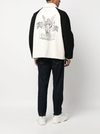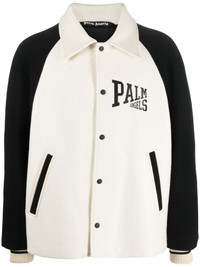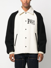 University virgin-wool bomber jacket Taking inspiration from classic varsity designs, Palm Angels introduces this University bomber jacket. Constructed from soft virgin wool, it features a two-tone layout highlighted by contrasting raglan sleeves and an angelic graphic print on the back. Highlights - Ivory white/black - Virgin wool - Logo print at the chest - Graphic print to the rear - Two-tone design - Classic collar - Front press-stud fastening - Long raglan sleeves - Ribbed cuffs - Two side welt pockets - Straight hem Made in Italy Composition Outer: Virgin Wool 100%, Polyester 100%, Polyamide 96%, Elastane 4% Lining: Cupro 100% SIZE & FIT Model measurements Height 6 ft 2 in(1.88 m) Bust/Chest 36.61 in(93 cm) Hips 37.79 in(96 cm) Waist 28.74 in(73 cm) FittingInformation Designed for a boxy fit, intended for a loose fit throughout Made from a midweight non-stretch fabric This piece fits true to size – take your usual size Washing instructions Dry Clean Only