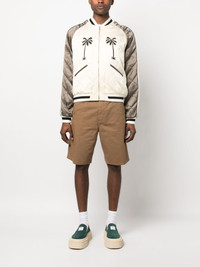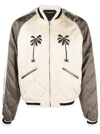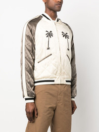 Upsidedown Palm Sukajan jacket Sharp streetwear inspired by the '70s skate scene dominates Palm Angels' SS23 collection, as evidenced by this beige and cream bomber jacket. All-over quilting elevates the garment, while embroidered palm trees at the front and back emphasises the label's playful spirit. Highlights - Beige/cream - Cotton blend - Quilted finish - Band collar - Long sleeves - Palm tree embroidery - Front zip fastening - Two side slit pockets - Embroidered artwork and logo at back - Ribbed trims - Straight hem Made in Italy Composition Outer: Cupro 100% Lining: Cupro 100% Trims: Viscose 74%, Wool 50%, Acrylic 50%, Cotton 26%