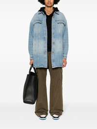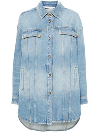 washed-logo denim jacket Highlights - Indigo blue - Cotton - Washed denim - Whiskering effect - Ripped detailing - Spread collar - Long sleeves with buttoned cuffs - Pleat detailing at the sleeves - Panel detailing - Two front flap pockets - Two side welt pockets - Washed logo stamp to the rear - Logo-engraved buttons - Unlined - Rear curved hem - Gold-tone hardware - Front button placket Made in Italy Composition Outer: Cotton 100% Lining: Polyester 65%, Cotton 35% SIZE & FIT Model measurements Height 5 ft 10 in(1.77 m) Bust/Chest 33.07 in(84 cm) Hips 37 in(94 cm) Waist 24.8 in(63 cm) FittingInformation Designed to be unstructured, offering a loose fit throughout Sturdy and hard-wearing, this denim piece offers no stretch This piece fits true to size – take your usual size