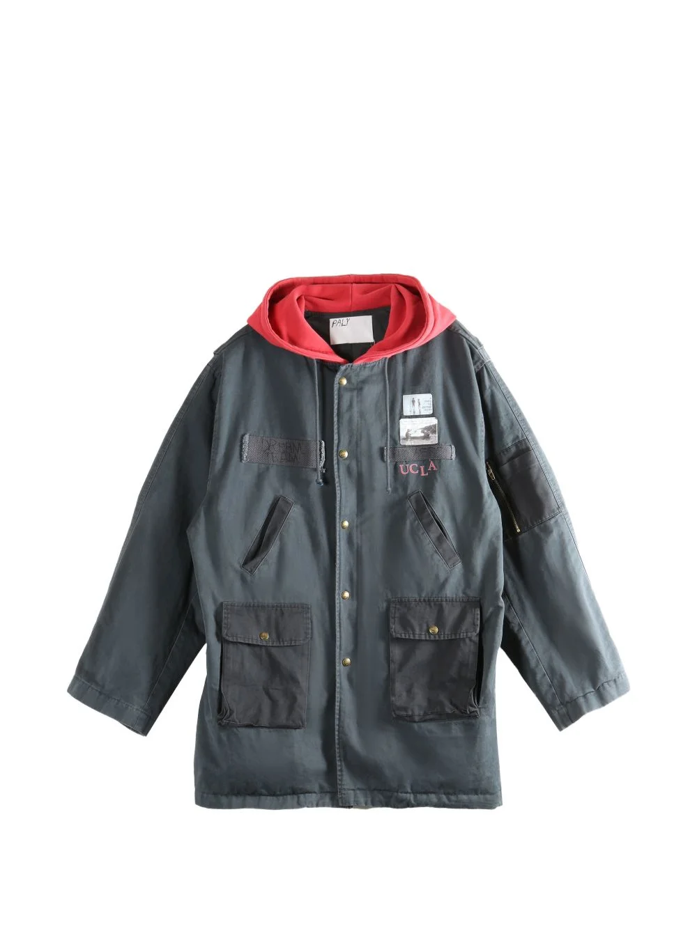 hooded patch-detail jacket Highlights - Grey - Classic hood - Front flap pockets - Zip pocket to the sleeve - Patch detail - Front button fastening Made in United States Composition Cotton 100% Washing instructions Read Manufacturer Guidelines