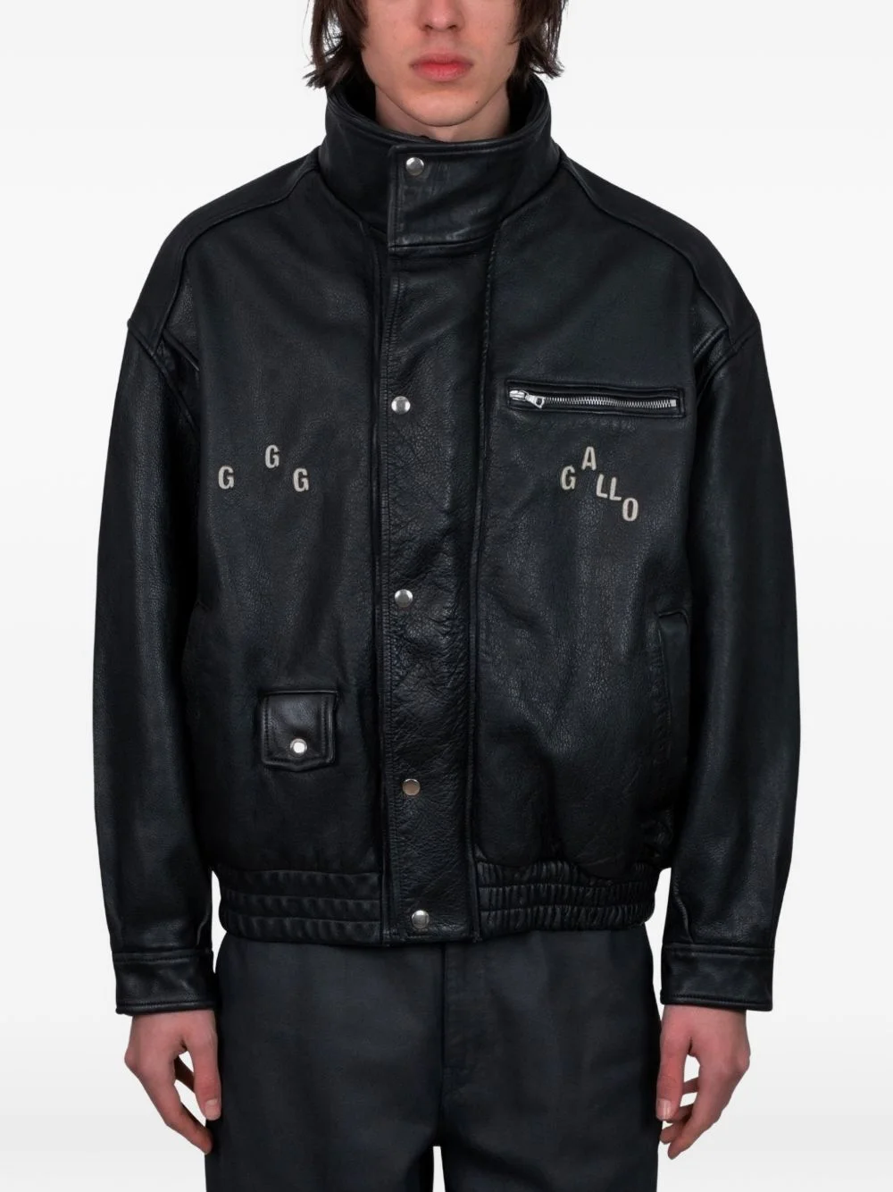 leather bomber jacket Highlights - Black - Leather - Front zip pocket - Button fastening - Elasticated hem - Embroidered detail at the back Made in Italy Composition Calf Leather 100% Washing instructions Read Manufacturer Guidelines