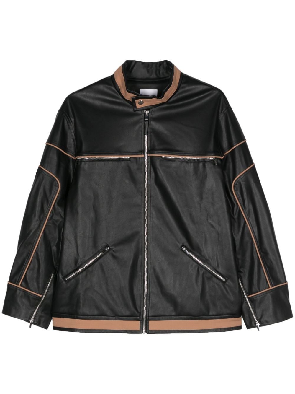 contrasting-trim biker jacket Highlights - Black/light brown - Faux leather - Grained texture - Contrasting trim - Panelled design - Belted waist tabs - Press-stud fastening collar - Band collar - Long sleeves - Cuff zips - Two zip-fastening chest pockets - Two front zip-fastening pockets - Front zip fastening - Straight hem - Full lining Imported Composition Outer: Polyurethane 60%, Cotton 58%, Polyester 40%, Nylon 39%, Spandex/Elastane 3% Lining: Viscose 55%, Rayon 45%