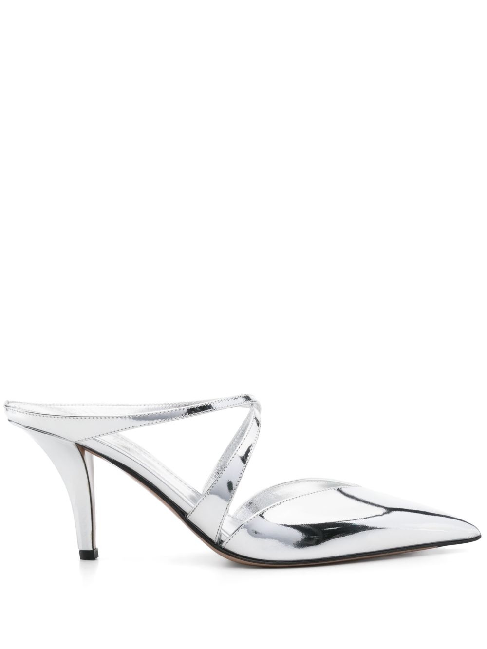 85mm Laila mules Highlights - Silver-tone - Sculpted heel - Branded insole - Crossover strap detail - Pointed toe Made in Italy Composition Sole: Calf Leather 100%, Rubber 100% Outer: Patent Calf Leather 100% Lining: Calf Leather 100% SIZE & FIT Measurement HEEL 3.34 in(8.5 cm)