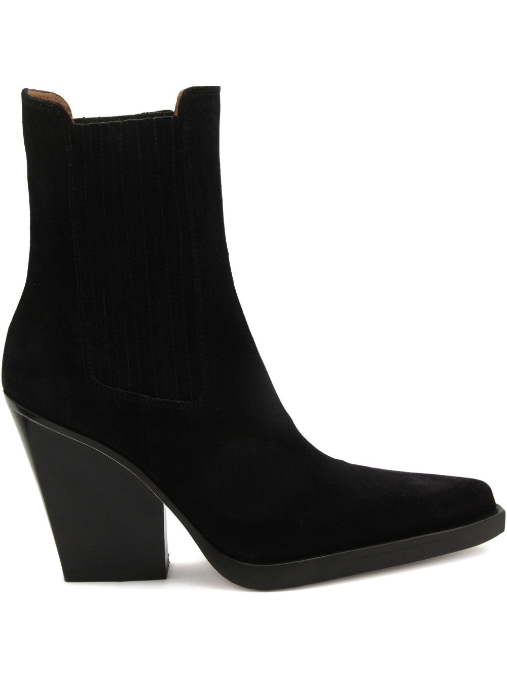 elastic-panel pointed-toe boots Crafted from leather in Italy, these Dallas boots are a prime example of Paris Texas concept of contrasts. In a black hue, this pair is punctuated by a bold high block heel. Highlights - Black - Suede upper - Pointed toe - Elastic side panel - Block heel - Cuban heel Made in Italy Composition Lining: Calf Leather 100% Sole: Calf Leather 100% Outer: Calf Leather 100% SIZE & FIT Measurement HEEL 4.13 in(10.5 cm) HEIGHT 5.9 in(15 cm) Sole height 0.39 in(1 cm)