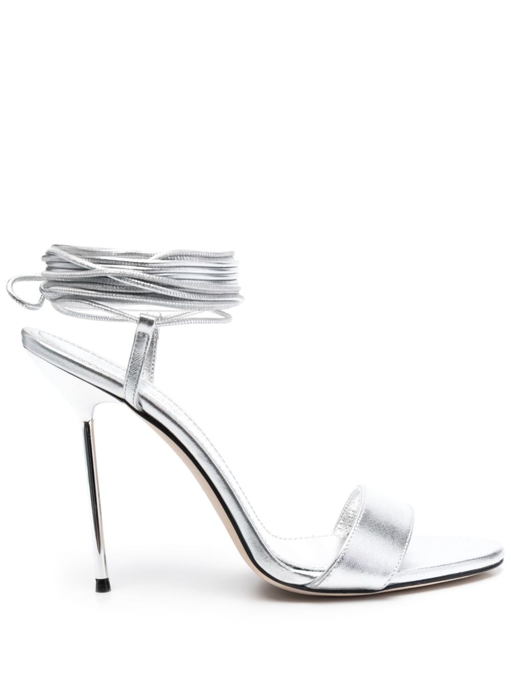 Guya 105mm lace-up sandals Crafted from silver-tone metallic leather, these Guya sandals reflect PARIS TEXAS' effervescent essence. They are set on a 105mm stiletto heel and feature extra-long lace-up straps that can be laced all the way up the leg. Highlights - Silver-tone - Calf leather - Metallic effect - Open toe - Tie-fastening ankle strap - Branded insole - High 105mm stiletto heel Made in Italy Composition Outer: Calf Leather 100% Lining: Calf Leather 100% Sole: Calf Leather 100% SIZE & FIT Measurement HEEL 4.33 in(11 cm)
