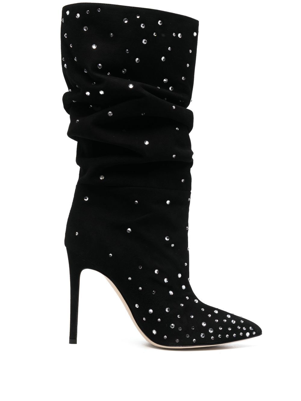 Holly 110mm stiletto boots black calf leather crystal embellishment ruched detailing mid-calf length pointed toe high heel Made in Italy Composition Lining: Calf Leather 100% Outer: Calf Leather 100% Sole: Calf Leather 100% SIZE & FIT Measurement CIRCUMFERENCE 14.96 in(38 cm) HEEL 4.33 in(11 cm) HEIGHT 10.23 in(26 cm)