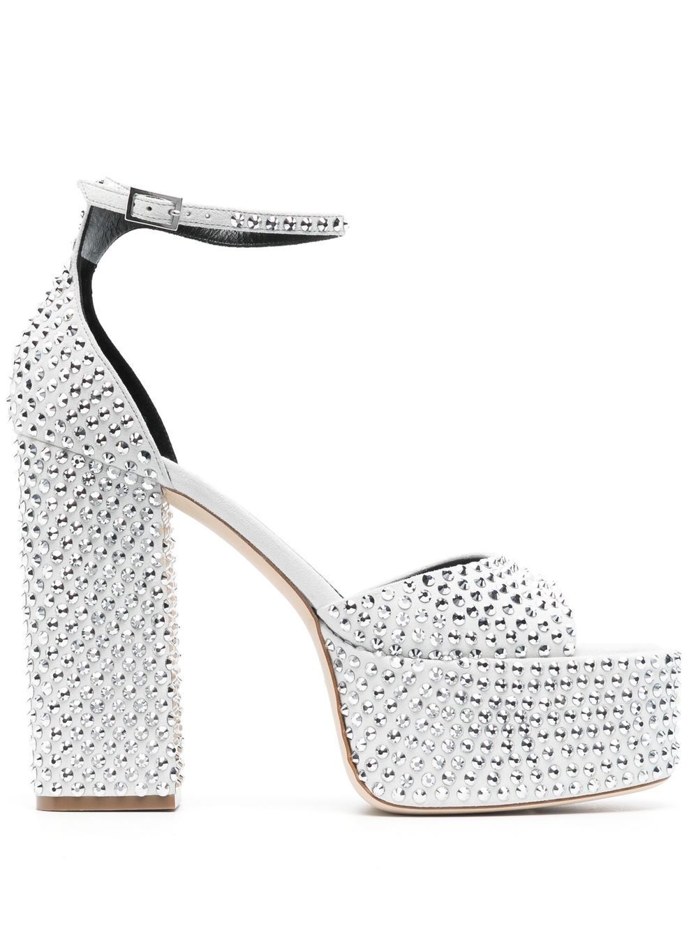 Tatiana 130mm platform sandals silver-tone calf suede crystal embellishment open toe single toe strap buckle-fastening ankle strap branded footbed platform sole high block heel Made in Italy Composition Suede 100% SIZE & FIT Measurement PLATFORM 1.96 in(5 cm) CIRCUMFERENCE 7.87 in(20 cm) HEEL 4.72 in(12 cm)