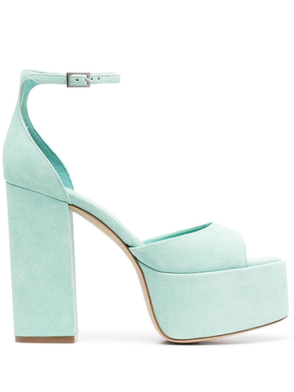Tatiana 130mm suede platform sandals aqua blue leather/suede open toe buckle-fastening ankle strap branded leather insole high block heel platform sole leather sole Made in Italy Composition Suede 100% SIZE & FIT Measurement CIRCUMFERENCE 8.26 in(21 cm) HEEL 5.11 in(13 cm) HEIGHT 3.54 in(9 cm) PLATFORM 2.16 in(5.5 cm) FittingInformation This piece fits large – take one size down