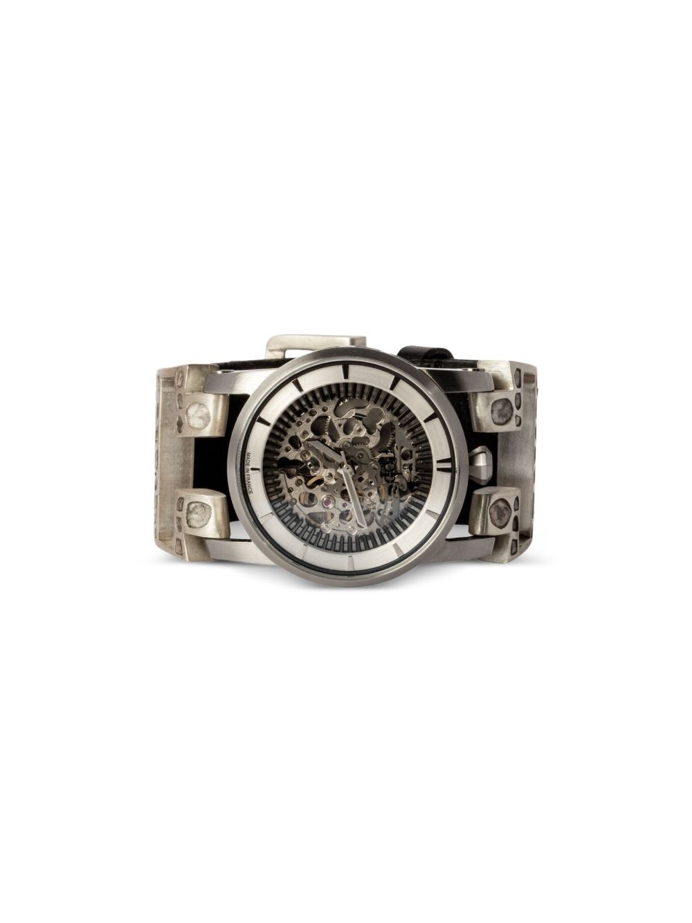 P4—FOB #442 41mm Highlights - Silver-tone dial - Black leather strap - Round case - Skeleton dial - Visible movement - Silver bezel - Automatic movement - Buckle clasp - This item comes with a standard one-year warranty from the brand. Imported SIZE & FIT Measurement WIDTH 1.18 in(3 cm)