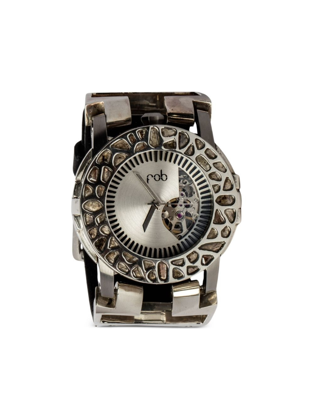 P4—FOB Watch #1429 42mm Highlights - Silver - 42mm - Round case - Open heart dial - Pave bezel - Automatic movement - Buckle crown - This item comes with a standard one-year warranty from the boutique. - Normal everyday use and external agents may reduce the lustre of gemstones and gold surfaces. to maintain, use specific, non-abrasive products specially meant for cleaning jewellery. Imported SIZE & FIT Measurement DIAMETER 1.65 in(4.2 cm) Maximum strap length 7.08 in(18 cm)