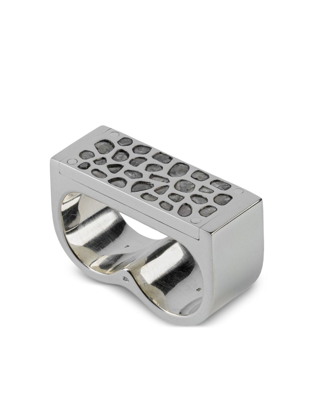 Plate Double diamond ring Highlights - Silver-tone - Sterling silver/diamond - Rectangular panel - Pave diamond setting - Irregular stone shapes - Double finger design - Normal everyday use and external agents may reduce the lustre of gemstones and gold surfaces. to maintain, use specific, non-abrasive products specially meant for cleaning jewellery. Imported SIZE & FIT Measurement Band Width 0.66 in(1.7 cm)