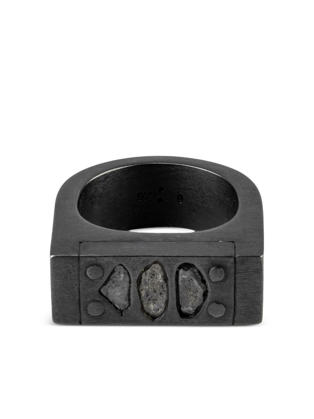 Plate Single three-diamond-slab ring Highlights - Silver-tone - Oxidised sterling silver/three diamond slabs - Rectangular face - Studded detailing - Normal everyday use and external agents may reduce the lustre of gemstones and gold surfaces. to maintain, use specific, non-abrasive products specially meant for cleaning jewellery. Imported SIZE & FIT Measurement Band Width 0.35 in(0.9 cm)