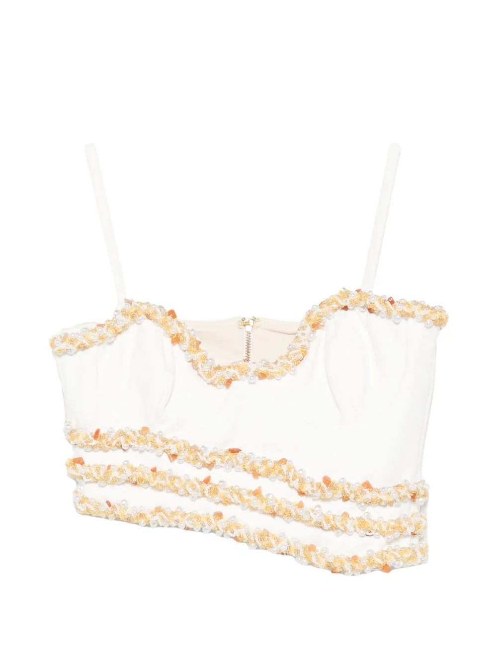 Jade embellished crop top Highlights - Off-white - Beaded embellishment - Spaghetti straps - Cropped - Zip fastening Imported Composition Outer: Polyamide 94%, Elastane 6% Lining: Polyamide 81%, Elastane 19% Washing instructions Hand Wash