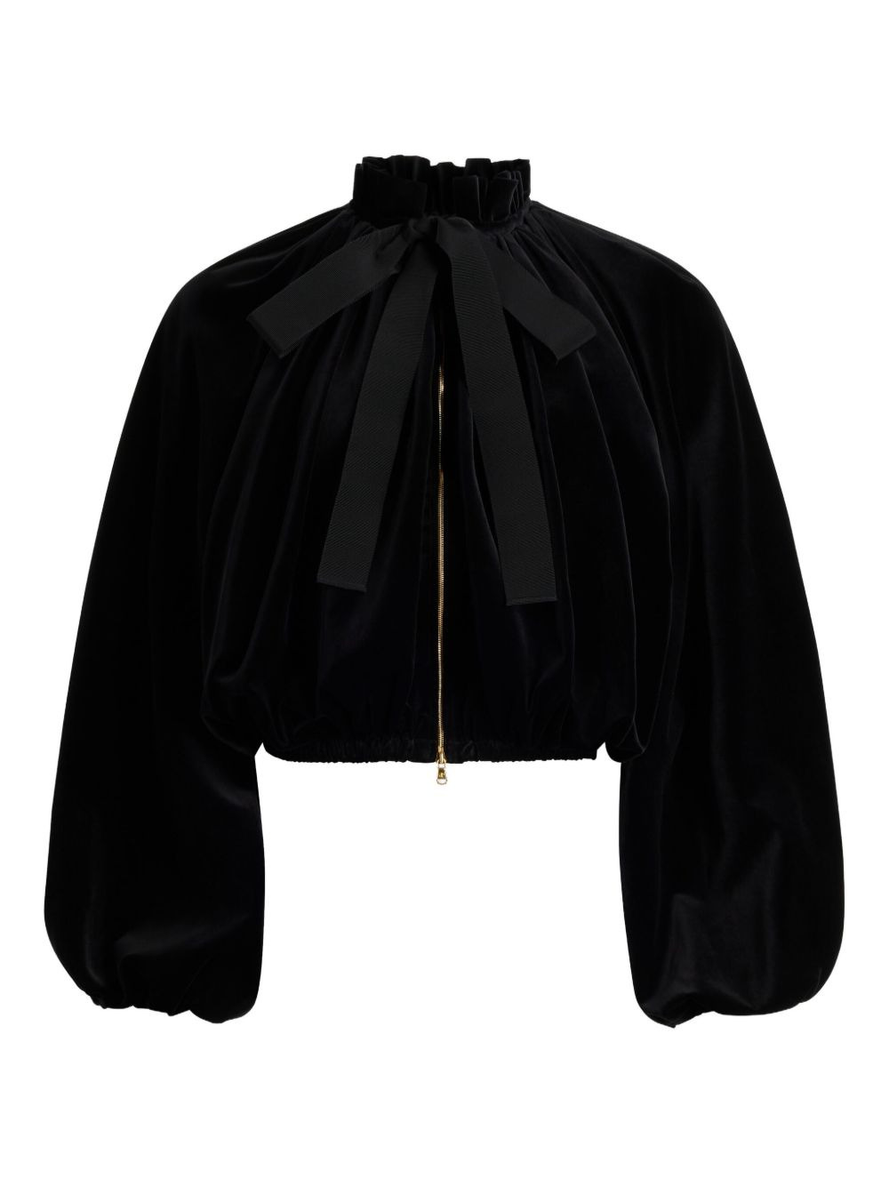 balloon-sleeve velvet jacket Highlights - Black - Velvet - Balloon sleeves - Gathered neckline - Zip fastening - Ribbon tie detail Imported Composition Lining: Viscose 100% Organic Cotton 100% Washing instructions Read Manufacturer Guidelines