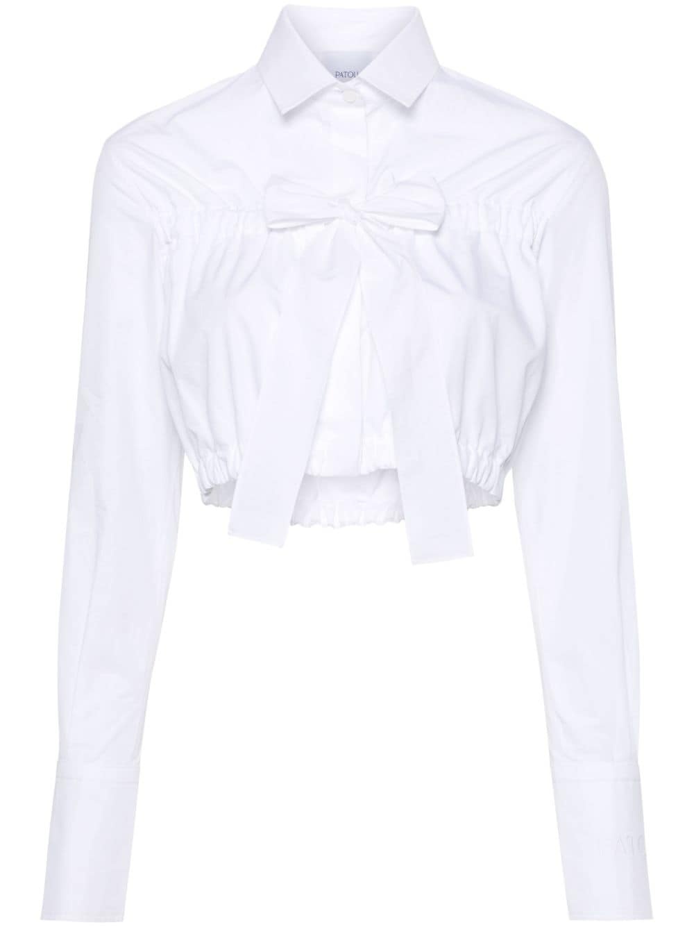 bow-detail cropped blouse Highlights - White - Cotton - Poplin texture - Ruched detailing - Pointed flat collar - Front button fastening - Front tie fastening - Long sleeves with buttoned cuffs - Elasticated bands - Elasticated hem - Cropped Imported Composition Cotton 100% SIZE & FIT Model measurements Height 5 ft 10 in(1.78 m) Bust/Chest 31.49 in(80 cm) Hips 35.03 in(89 cm) Waist 23.62 in(60 cm) FittingInformation Designed for a relaxed fit, this piece allows for comfort and movement when worn The adjustable drawstring means that you can adjust this piece’s fit to suit your comfort and preference Made from a midweight non-stretch fabric This piece fits true to size – take your usual size