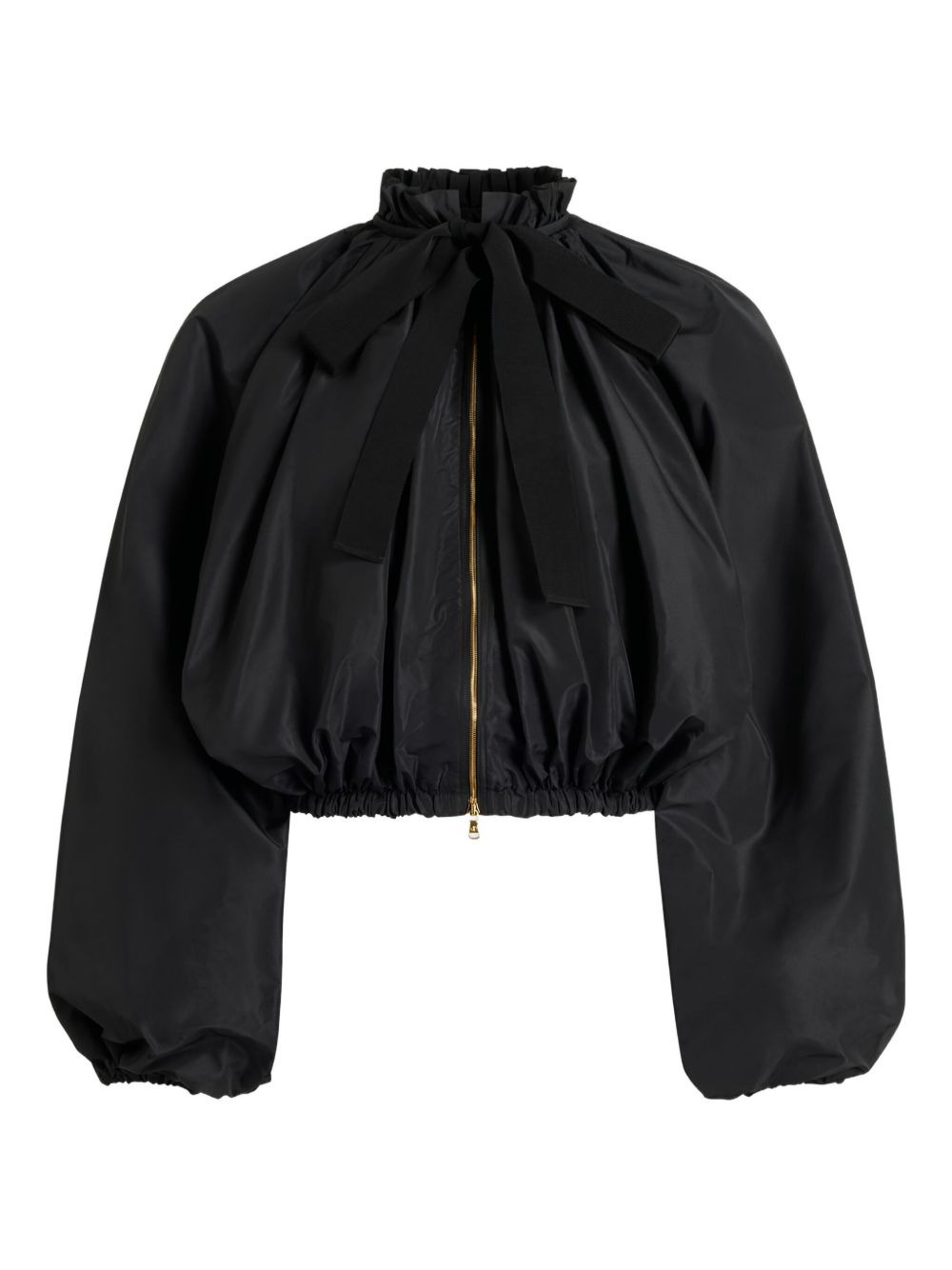 bow-detailed balloon-sleeve bomber jacket Highlights - Black - Ruffled high neck - Balloon sleeves - Zip fastening - Bow detail Imported Composition Lining: Cotton 100% Recycled Polyester 100% SIZE & FIT Measurement LENGTH 20.86 in(53 cm) WAIST 29.13 in(74 cm) BUST 44.09 in(112 cm) Washing instructions Read Manufacturer Guidelines