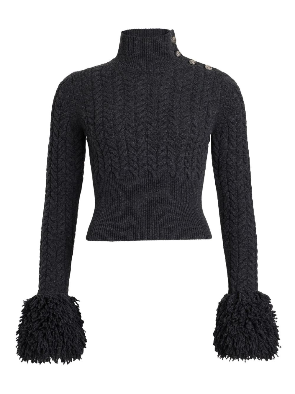 cable-knit fringe-trimmed jumper Highlights - Dark grey - Cable knit - High neck - Button detail - Fringe-trimmed cuffs - Wool cashmere blend Imported Composition Merino 100% Washing instructions Dry Clean Only