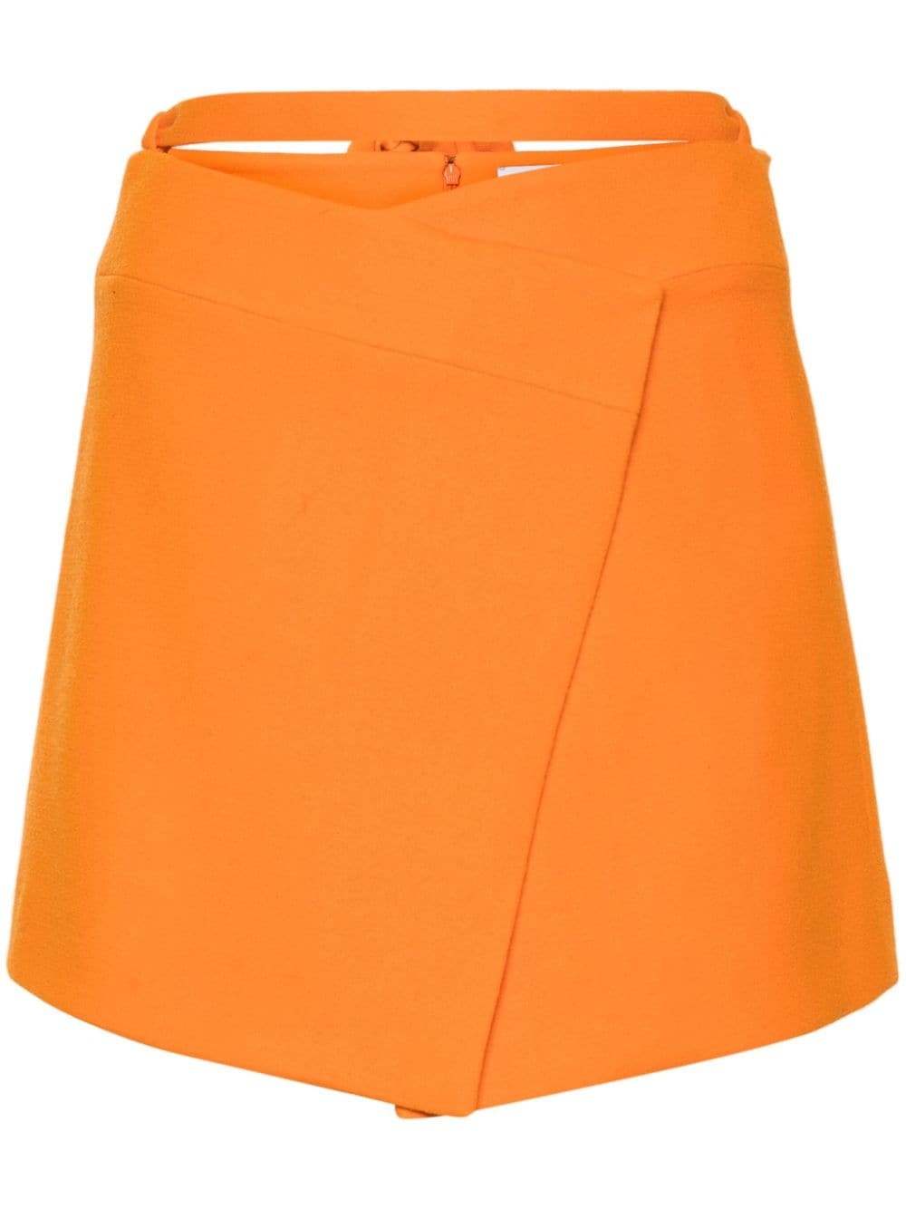 wraparound mini skirt Highlights - Orange - Virgin wool - Crepe texture - Wrap design - Dart detailing - Belt loops - Detachable adjustable waist strap - Concealed rear hook and zip fastening - Thigh-length - Asymmetric hem - Unlined Imported Composition Virgin Wool 100% SIZE & FIT Model measurements Height 5 ft 9 in(1.75 m) Bust/Chest 34.64 in(88 cm) Hips 36.61 in(93 cm) Waist 26.37 in(67 cm) FittingInformation This mini-length skirt is intended to be worn just below the waist The tie fastening gives an adaptable and personalised fit Made from a midweight non-stretch fabric This piece fits true to size – take your usual size
