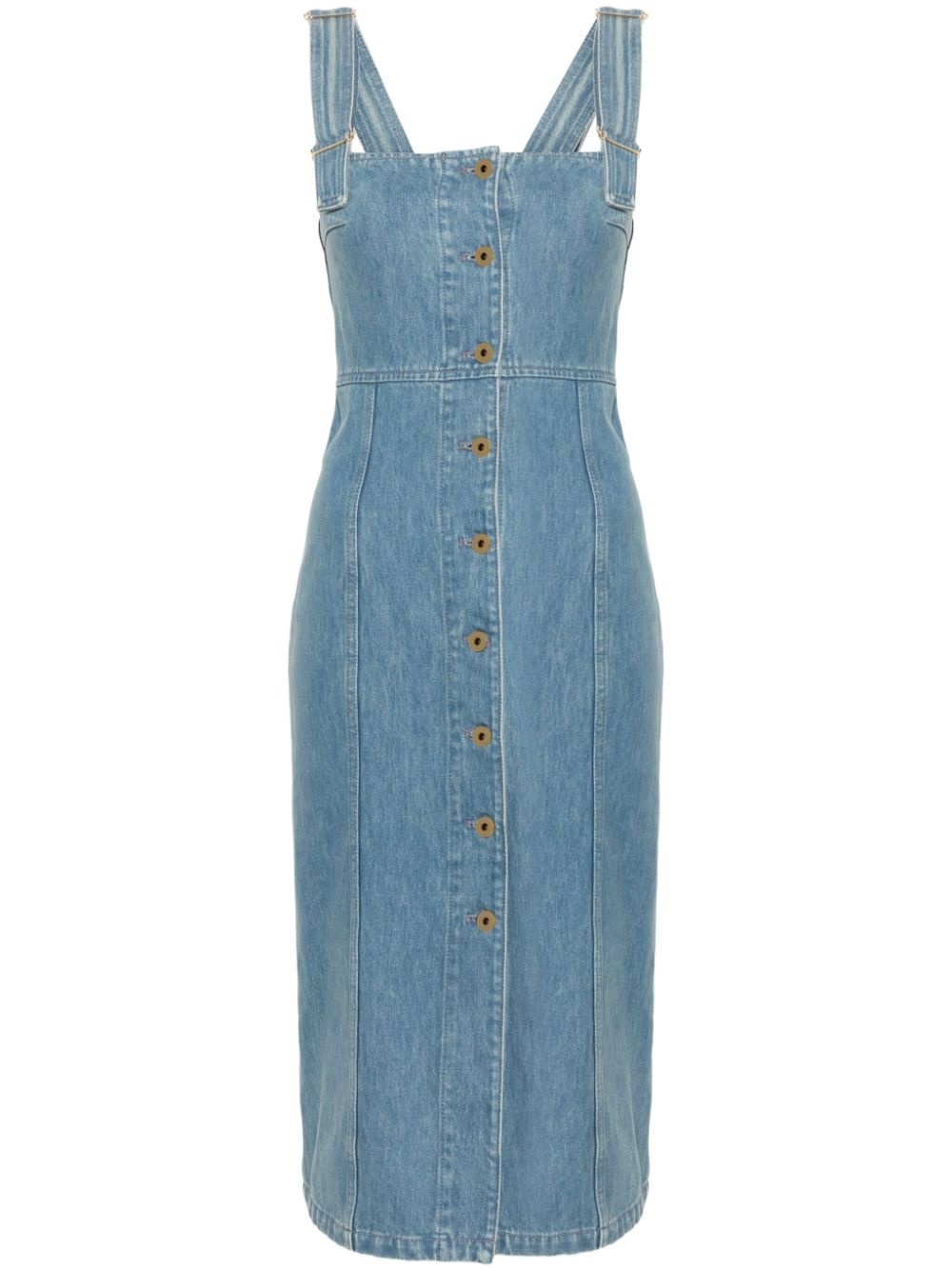 denim midi dress Highlights - Blue - Cotton blend - Denim - Round neck - Adjustable shoulder straps - Seam detailing - Central rear vent - Straight hem - Partial lining - Front button fastening Imported Composition Cotton 92%, Polyester 8% SIZE & FIT Model measurements Height 5 ft 9 in(1.75 m) Bust/Chest 34.64 in(88 cm) Hips 36.61 in(93 cm) Waist 26.37 in(67 cm) FittingInformation Designed for a close fit throughout The adjustable shoulder straps allow for a preferred fit when worn Sturdy and hard-wearing, this denim piece offers no stretch This piece fits true to size – those with curvy hips may wish to take one size up