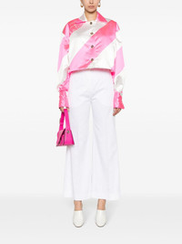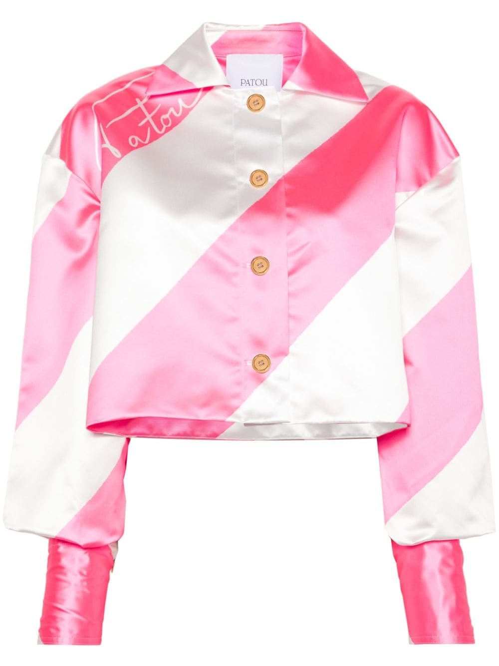 diagonal-striped cropped satin jacket Highlights - Fluorescent pink/white - Duchess satin weave - Diagonal stripe pattern - Notched collar - Drop shoulder - Logo print to the shoulder - Long sleeves with buttoned cuffs - Gold-tone buttons - Cropped - Straight hem - Front button fastening Imported Composition Polyester 100% SIZE & FIT Model measurements Height 5 ft 11 in(1.8 m) Bust/Chest 33.07 in(84 cm) Hips 37 in(94 cm) Waist 25.59 in(65 cm) FittingInformation Designed for a boxy fit, intended for a loose fit throughout Cropped in length Made from a midweight non-stretch fabric This piece fits true to size – take your usual size