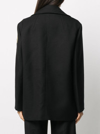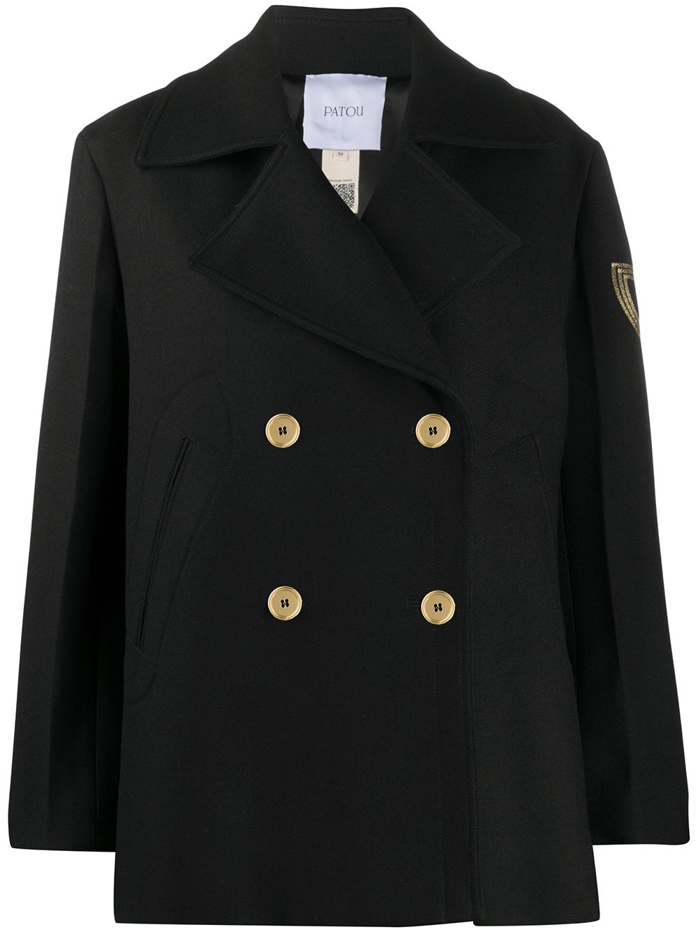 logo-embroidered wool peacoat Contemporary craftsmanship is showcased in this black peacoat from Patou. The gold embroidered logo on the sleeve contrasts with the black sleeve and pocket details, creating a refined look. Highlights - Black - Virgin wool - Double-breasted button fastening - Wide notch lapels - Two front welt pockets - Long sleeves - Contrasting embroidered logo on the sleeve Imported Composition Virgin Wool 100% SIZE & FIT Model measurements Height 5 ft 10 in(1.78 m) Bust/Chest 31.49 in(80 cm) Hips 36.22 in(92 cm) Waist 25.59 in(65 cm) Measurement CHEST 44.09 in(112 cm) SLEEVE LENGTH 24.01 in(61 cm) LENGTH 29.52 in(75 cm) FittingInformation This piece fits true to size. We recommend you get your regular size Cut for a loose fit Made with a mid-weight non-stretch fabric Washing instructions Dry Clean Only