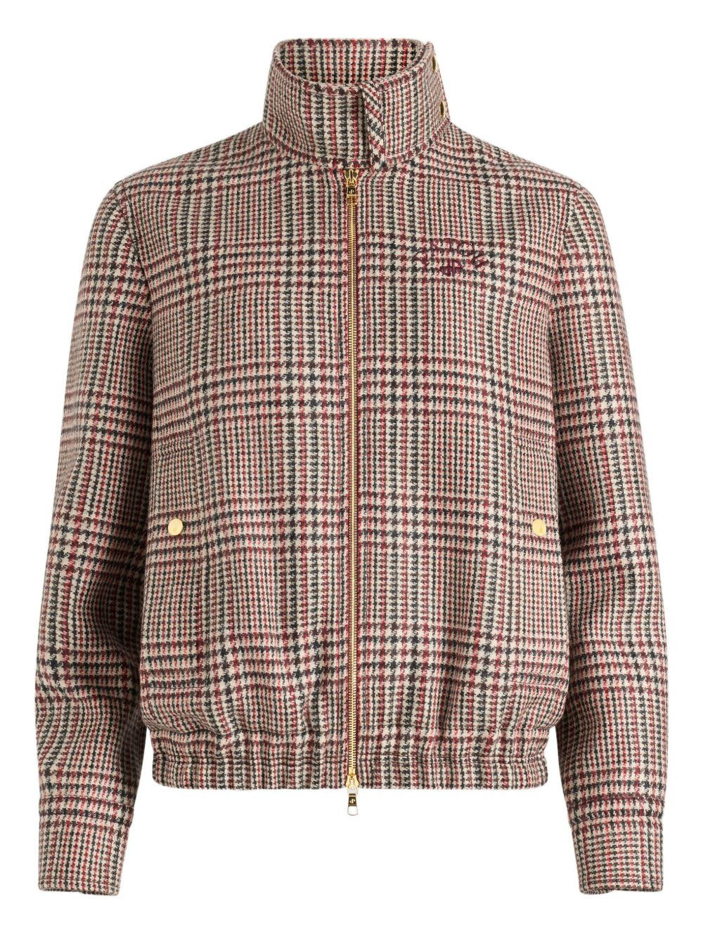 high-neck houndstooth bomber jacket Highlights - Beige - Houndstooth pattern - Zip fastening - High neck - Gold-tone hardware - Embroidered logo Imported Composition Lining: Viscose 100% Outer: Virgin Wool 100% Washing instructions Dry Clean Only