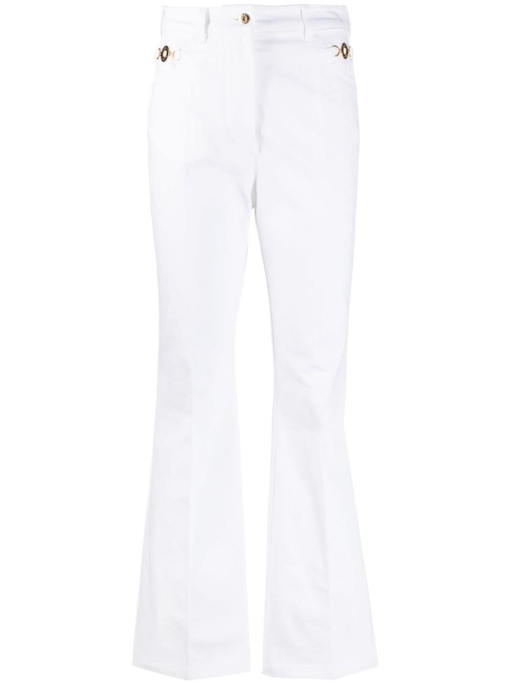 logo-embroidered flared jeans Patou's jeans honour flared styles that were characteristic of the 70s. This high-rise pair is decorated with a logo plaque and gleaming gold-tone hardware at the side slip pocket - they pop against the white background. Highlights - White - Cotton - Denim - Logo plaque - Gold-tone hardware - Pressed crease - Belt loops - Front button and zip fastening - Embroidered logo - Slip pockets to the sides - Flared cuffs Imported Composition Cotton 100% SIZE & FIT Model measurements Height 5 ft 10 in(1.77 m) Bust/Chest 29.92 in(76 cm) Hips 34.25 in(87 cm) Waist 23.62 in(60 cm) Measurement FRONT RISE 11.81 in(30 cm) INSIDE LEG 29.52 in(75 cm) HIPS 36.81 in(93.5 cm) FittingInformation Designed with a flared hem, these jeans allow for a close fit at the waist with a slim fit over the leg and widening towards the hem Sturdy and hard-wearing, this denim piece offers no stretch This piece fits true to size – take your usual size Washing instructions Machine Wash