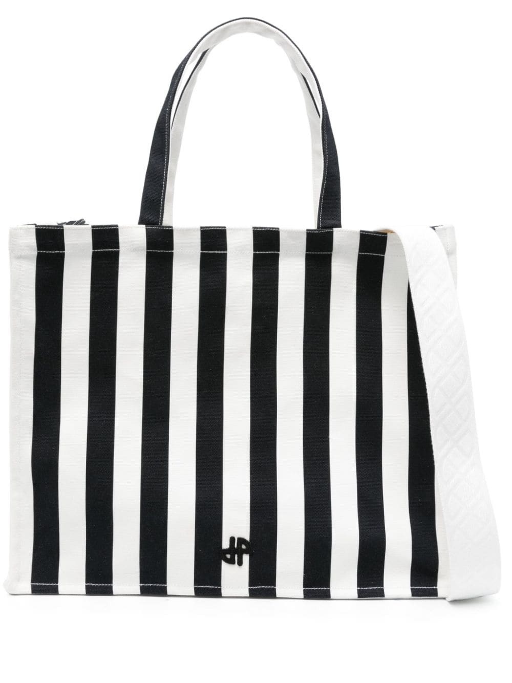 large JP striped canvas tote bag Highlights - White/black - Cotton - Canvas - Vertical stripe pattern - Logo patch to the front - Two flat top handles - Detachable logo-embossed shoulder strap - Gold-tone logo-debossed buttons - Main compartment - Internal logo patch - Open top Imported Composition Outer: Polyester 100%, Cotton 100% SIZE & FIT Model measurements Height 5 ft 11 in(1.8 m) Bust/Chest 33.07 in(84 cm) Hips 37.4 in(95 cm) Waist 25.19 in(64 cm) Measurement DEPTH 7.48 in(19 cm) HANDLE 7.87 in(20 cm) HEIGHT 13.38 in(34 cm) STRAP 37.4 in(95 cm)