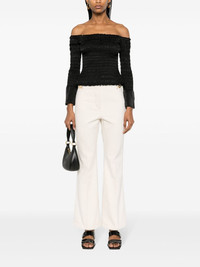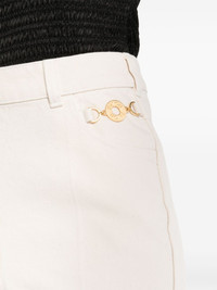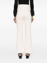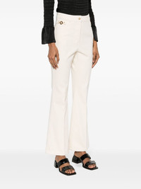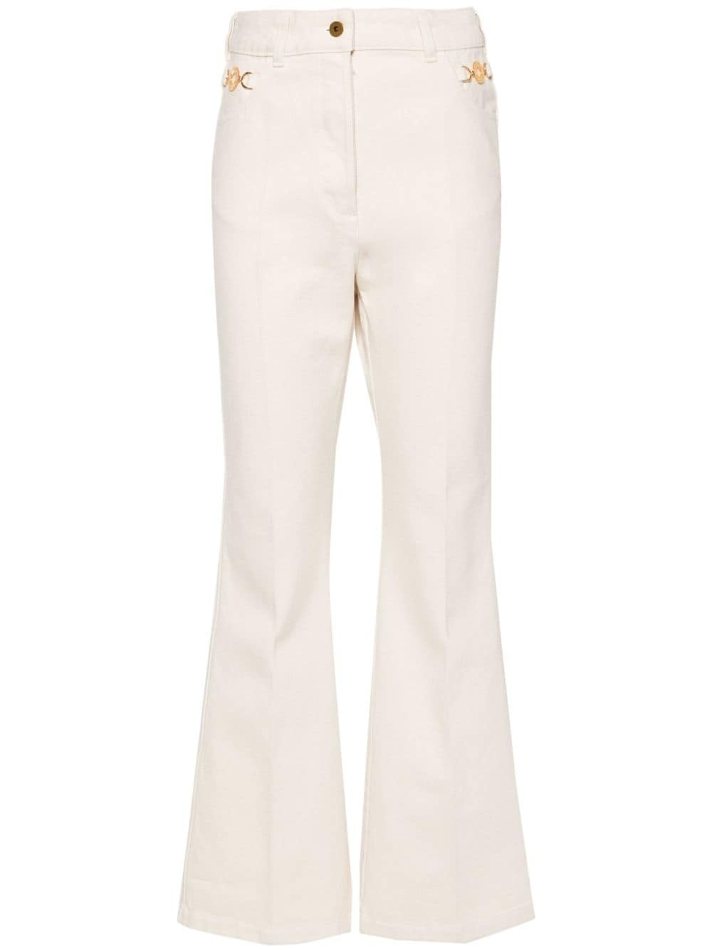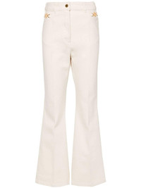 flared denim trousers Highlights - Light beige - Cotton - Twill weave - Metallic detailing to the front - Embroidered logo to the rear - Belt loops - Two side slit pockets - Pressed crease - Flared - Front button fastening Imported Composition Cotton 100% SIZE & FIT Model measurements Height 5 ft 11 in(1.8 m) Bust/Chest 31.49 in(80 cm) Hips 35.82 in(91 cm) Waist 24.8 in(63 cm)