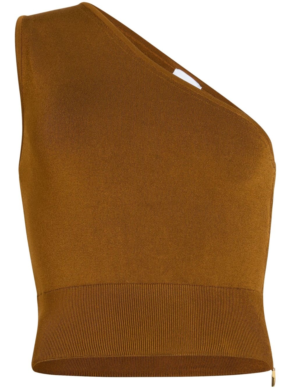 one-shoulder knitted top Highlights - Caramel brown - Side zip fastening - Asymmetric neck - Sleeveless - Ribbed hem Imported Composition Viscose 81%, Polyamide 19%
