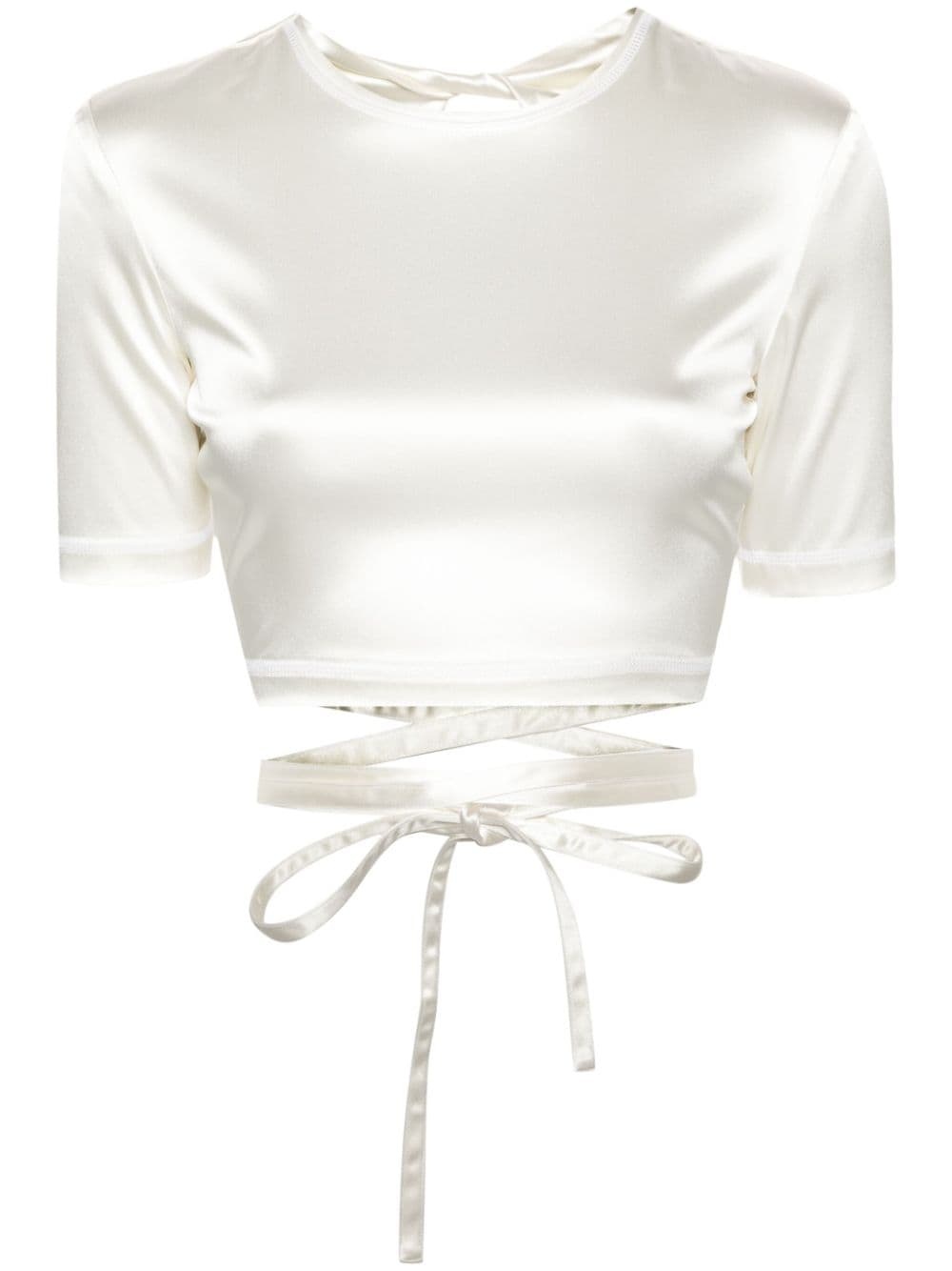 open-back satin T-shirt Highlights - Cream white - Satin finish - Round neck - Short sleeves - Open back - Twist detailing - Rear self-tie fastening Imported Composition Acetate 48%, Polyamide 45%, Lyocell 7% SIZE & FIT Model measurements Height 5 ft 10 in(1.78 m) Bust/Chest 33.46 in(85 cm) Hips 36.22 in(92 cm) Waist 23.22 in(59 cm) FittingInformation Designed for a close fit throughout The adjustable tie waist gives a more adaptable and personalised fit Made from a midweight non-stretch fabric, this piece offers minimal elasticity when worn This piece fits true to size – take your usual size