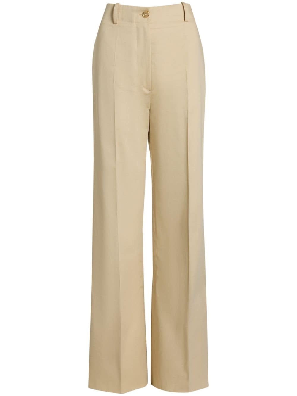 organic-cotton flared trousers Highlights - Sand beige - Organic cotton - Tweed - Pressed crease - High-waisted - Button fly fastening - Belt loops - Tailored design - Two side slit pockets Imported Composition Organic Cotton 100% SIZE & FIT Measurement HIPS 35.43 in(90 cm) LENGTH 48.03 in(122 cm) WAIST 27.55 in(70 cm)