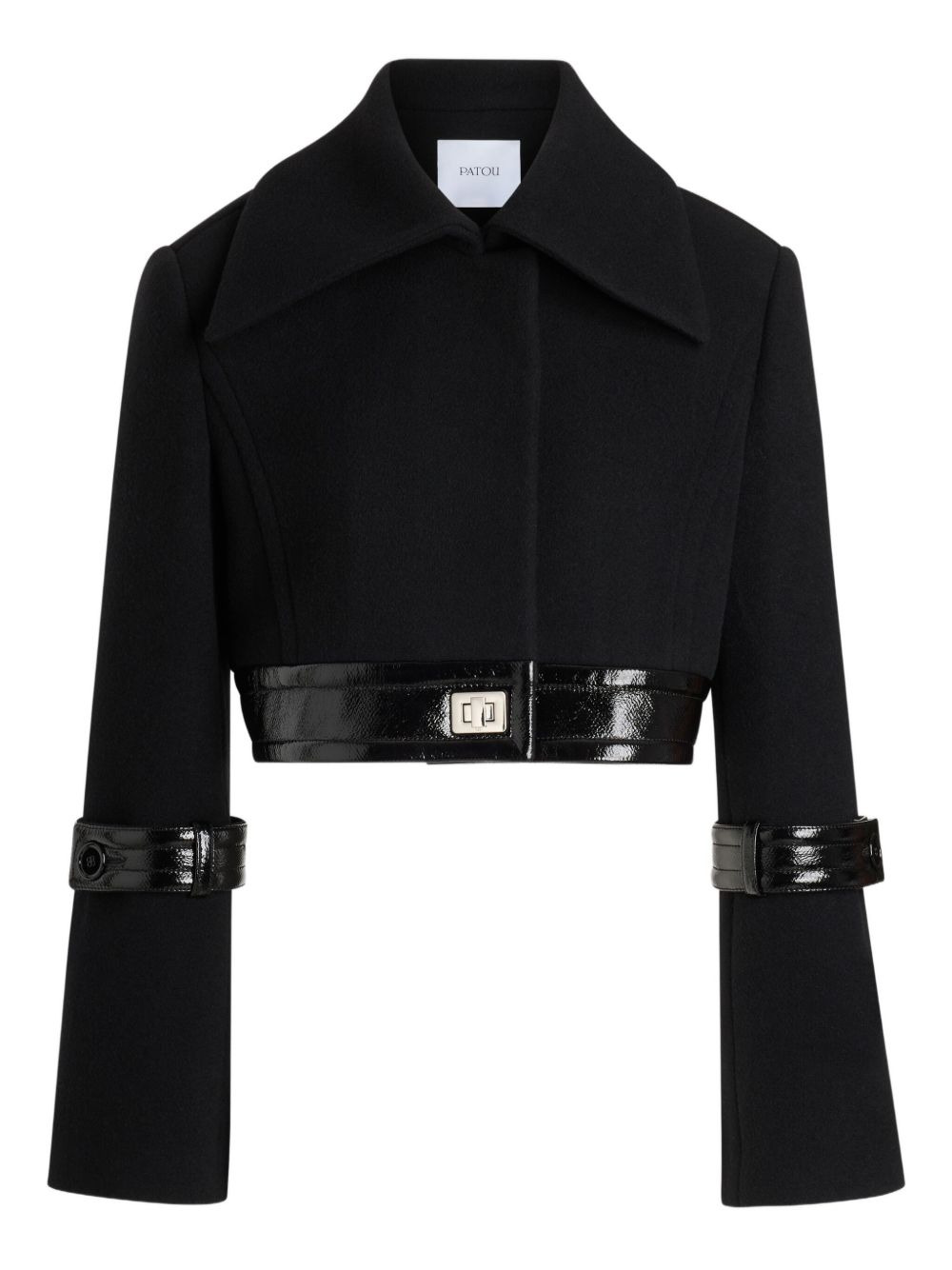 patent-trimmed wool jacket Highlights - Black - Patent leather trim - Cropped length - Wide sleeves - Button fastening - Oversize collar Imported Composition Lining: Viscose 100% Outer: Wool 100% Washing instructions Dry Clean Only