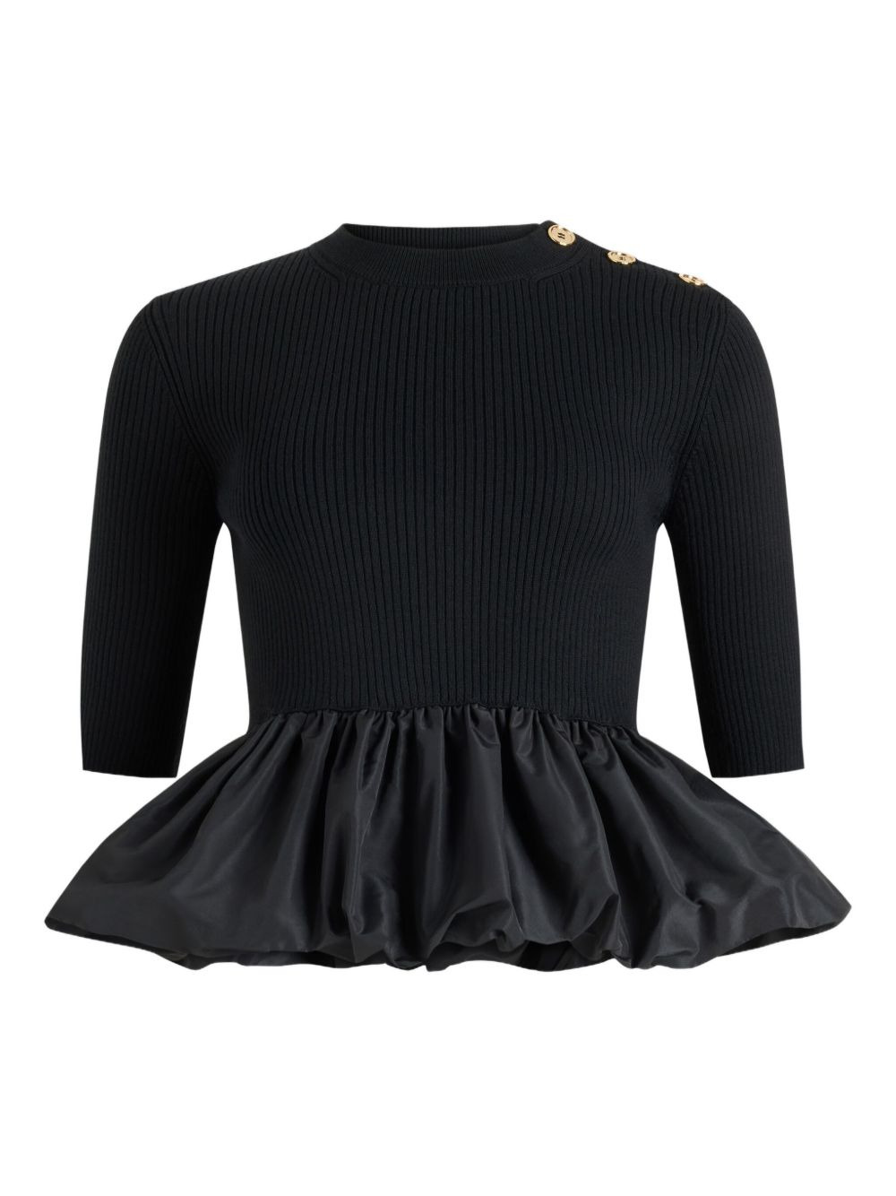 ribbed peplum top Highlights - Black - Ribbed knit - Peplum hem - Three-quarter sleeves - Round neck - Buttoned shoulder Imported Composition Recycled Polyester 100%, Merino 100% Washing instructions Dry Clean Only