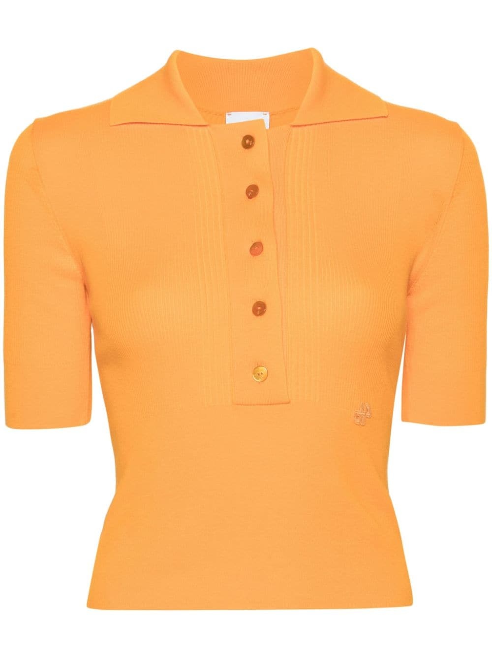 ribbed short-sleeve polo top Highlights - Apricot orange - Cotton - Ribbed knit - Logo-engraved buttons - Logo patch to the front - Spread collar - Short sleeves - Unlined - Straight hem - Front button placket Imported Composition Cotton 100% SIZE & FIT Model measurements Height 5 ft 10 in(1.77 m) Bust/Chest 32.28 in(82 cm) Hips 35.03 in(89 cm) Waist 25.19 in(64 cm) FittingInformation Designed for a slim fit that sits just away from the body offering a close yet comfortable fit Made with a lightweight knit, this piece offers some stretch This piece fits true to size – take your usual size