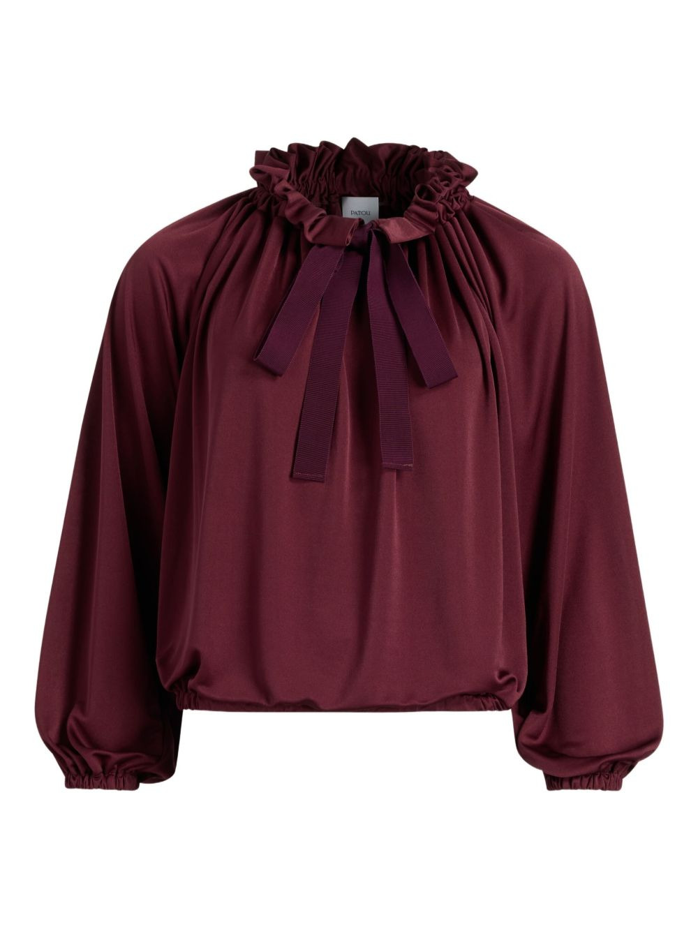 ruffled satin blouse Highlights - Burgundy - Ruffled neckline - Drawstring detail - Balloon sleeves - Satin jersey fabric Imported Composition Outer: Polyester 100% Washing instructions Hand Wash
