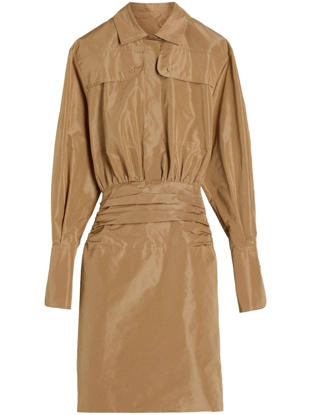 Safari dress Highlights - Sand beige - Recycled polyester - Sheer finish - Fitted waistline - Ruched detailing - Classic collar - Concealed front button fastening - Long sleeves - Buttoned cuffs - Two front safari pockets Imported Composition Recycled Polyester 100%