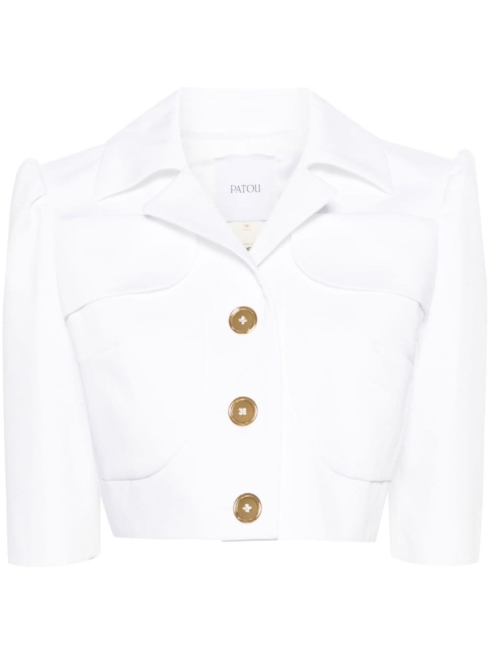 single-breasted cropped blazer Patou's summery take on classic tailoring, this white jacket is made from cotton gabardine to a cropped silhouette with puff shoulders. Logo-engraved golden buttons add a hint of illumination. Highlights - White - Cotton - Twill weave - Notched lapels - Front button fastening - Pinched shoulders - Half-length sleeves - Two front flap pockets - Rear slit - Cropped straight hem - Satin lining Imported Composition Cotton 100% SIZE & FIT Model measurements Height 5 ft 10 in(1.78 m) Bust/Chest 31.49 in(80 cm) Hips 35.03 in(89 cm) Waist 23.62 in(60 cm) FittingInformation Designed for a relaxed fit, this piece allows for comfort and movement when worn Cropped in length Made from a midweight non-stretch fabric This piece fits true to size – take your usual size