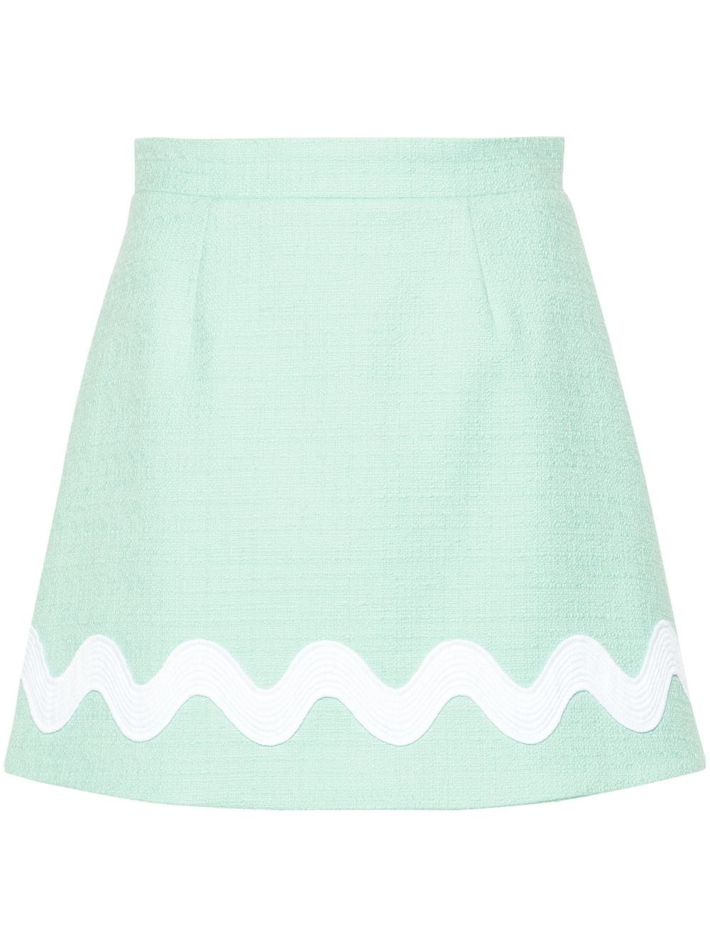 Wave tweed mini skirt Patou’s Guillaume Henry looks to the Sunday evening clubs he used to attend in Paris for inspiration behind this mini skirt. It’s cut from mint-green tweed with a wavy white stripe embroidered along the hem for a playful retro touch. Highlights - Mint green - White - Stretch-cotton - Tweed - Dart detailing - Stripe detailing - A-line - Thigh-length - Straight hem - Satin lining - Concealed rear zip fastening Imported Composition Outer: Cotton 97%, Polyamide 2%, Elastane 1% SIZE & FIT Model measurements Height 5 ft 10 in(1.78 m) Bust/Chest 31.49 in(80 cm) Hips 35.03 in(89 cm) Waist 23.62 in(60 cm) Measurement HIPS 39.76 in(101 cm) LENGTH 16.14 in(41 cm) WAIST 29.92 in(76 cm) FittingInformation This mini-length skirt is intended to be worn just below the waist Made from a midweight non-stretch fabric This piece fits true to size – take your usual size Washing instructions Dry Clean Only