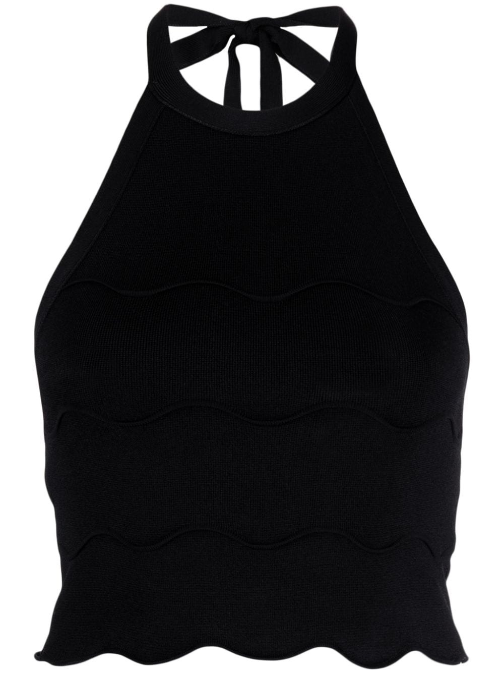 Wave Milano-knit halterneck top Highlights - Black - Embossed detail - Halterneck tie fastening - Scallop edge - Cropped Imported Composition Viscose 82%, Polyamide 16%, Elastane 2% SIZE & FIT Model measurements Height 5 ft 10 in(1.77 m) Bust/Chest 31.49 in(80 cm) Hips 35.43 in(90 cm) Waist 25.19 in(64 cm) FittingInformation Designed for a close fit throughout Made from a midweight stretch fabric, this piece offers elasticity and flexibility when worn This piece fits close in all sizes – take your usual size Washing instructions Hand Wash