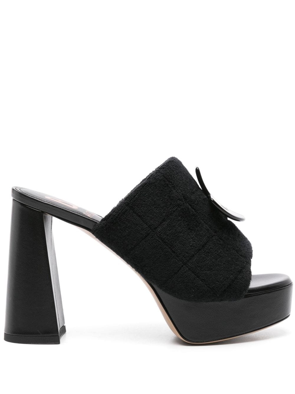 x Bettina Vermillon 110mm Anita sandals Highlights - Black - Logo plaque - Towelling finish - Short pile design - Slip-on style - Square open toe - Branded leather insole - 110mm block heel - Leather outsole Made in Italy Composition Outer: Lambskin 60%, Cotton 40% SIZE & FIT Measurement HEEL 4.33 in(11 cm) Sole height 1.18 in(3 cm)
