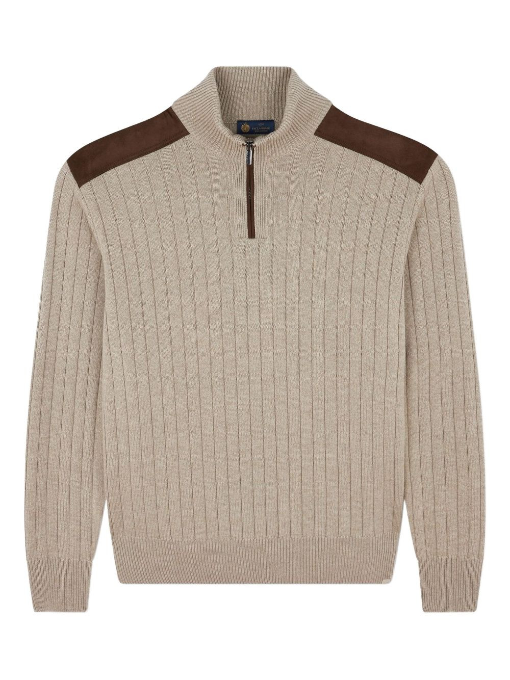 half-zip sweater Highlights - Beige - Ribbed knit - Suede shoulder panels - High neck - Half-zip fastening - Long sleeves Imported Composition Goat Skin 100%, Wool 45%, Viscose 30%, Cashmere 25% Washing instructions Read Manufacturer Guidelines