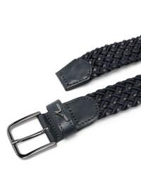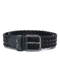 interwoven-design leather belt Highlights - Navy blue/black - Calf leather - Interwoven design - Logo plaque to the front - Adjustable fit - Buckle fastening Made in Italy Composition Outer: Recycled Leather 55%, Viscose 35%, Rubber 10% Lining: Calf Leather 100% SIZE & FIT Measurement Maximum Length 38.18 in(97 cm) TOTAL LENGTH 38.18 in(97 cm) WIDTH 1.18 in(3 cm)