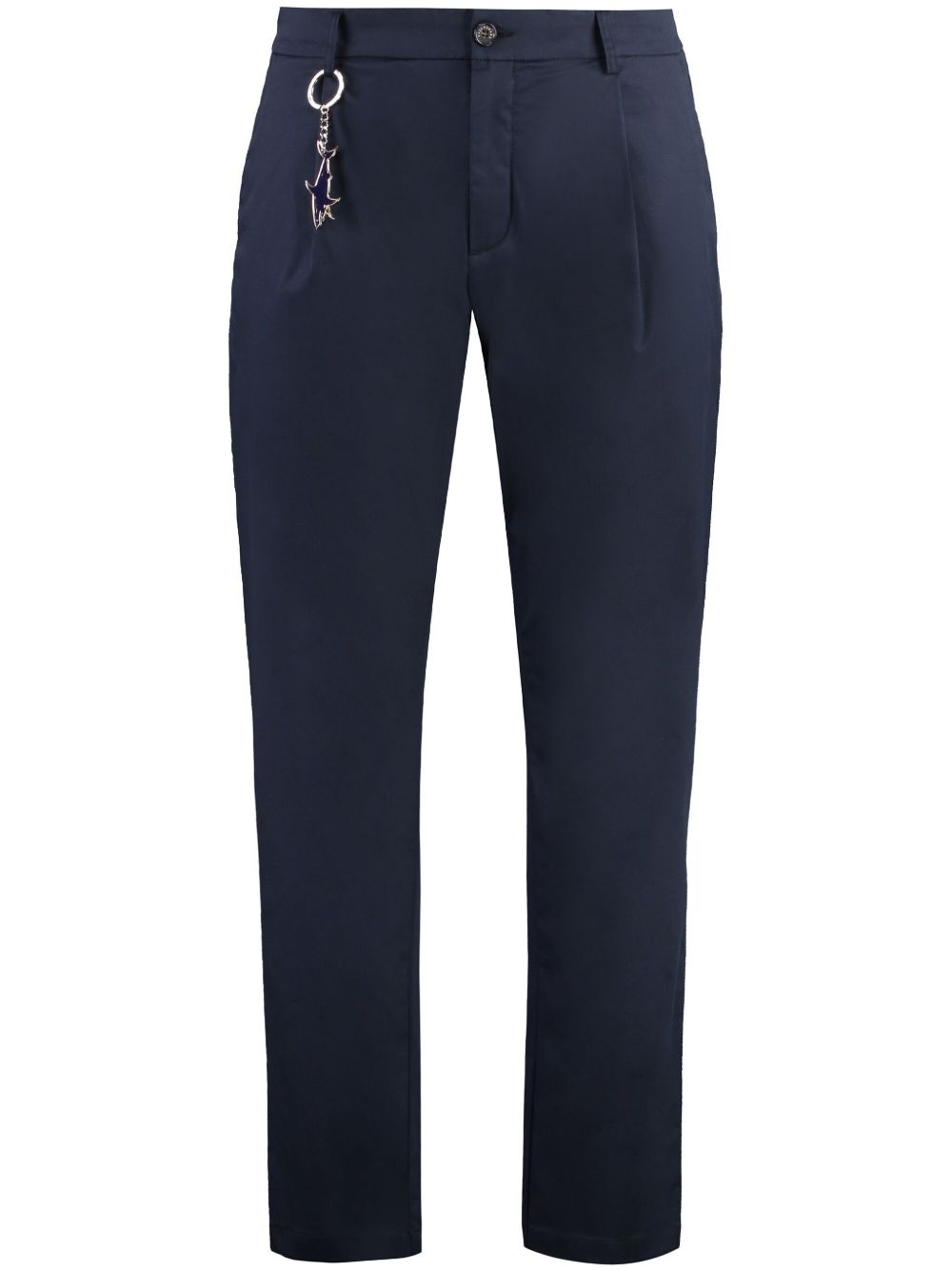 logo-applique trousers Highlights - Blue - Front button and zip fastening - Two side inset pockets - Two rear flap pockets - Applique logo Made in Italy Composition Cotton 99%, Elastane 1% Washing instructions Read Manufacturer Guidelines
